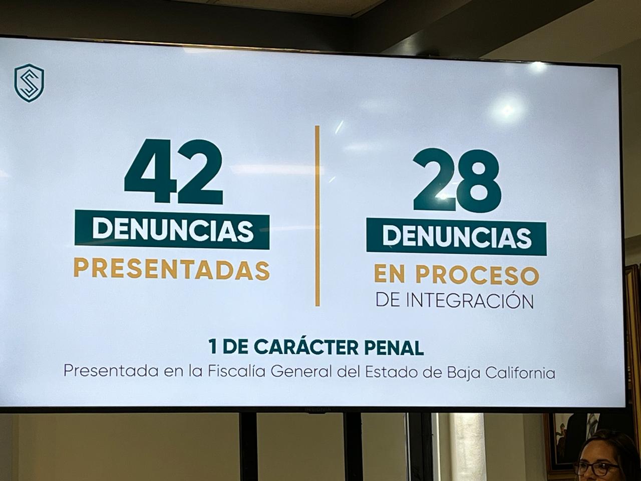 - Se contabilizaron 42 denuncias presentadas y 28 en proceso de integración, aunado a 1 que obra en la FGE BC.